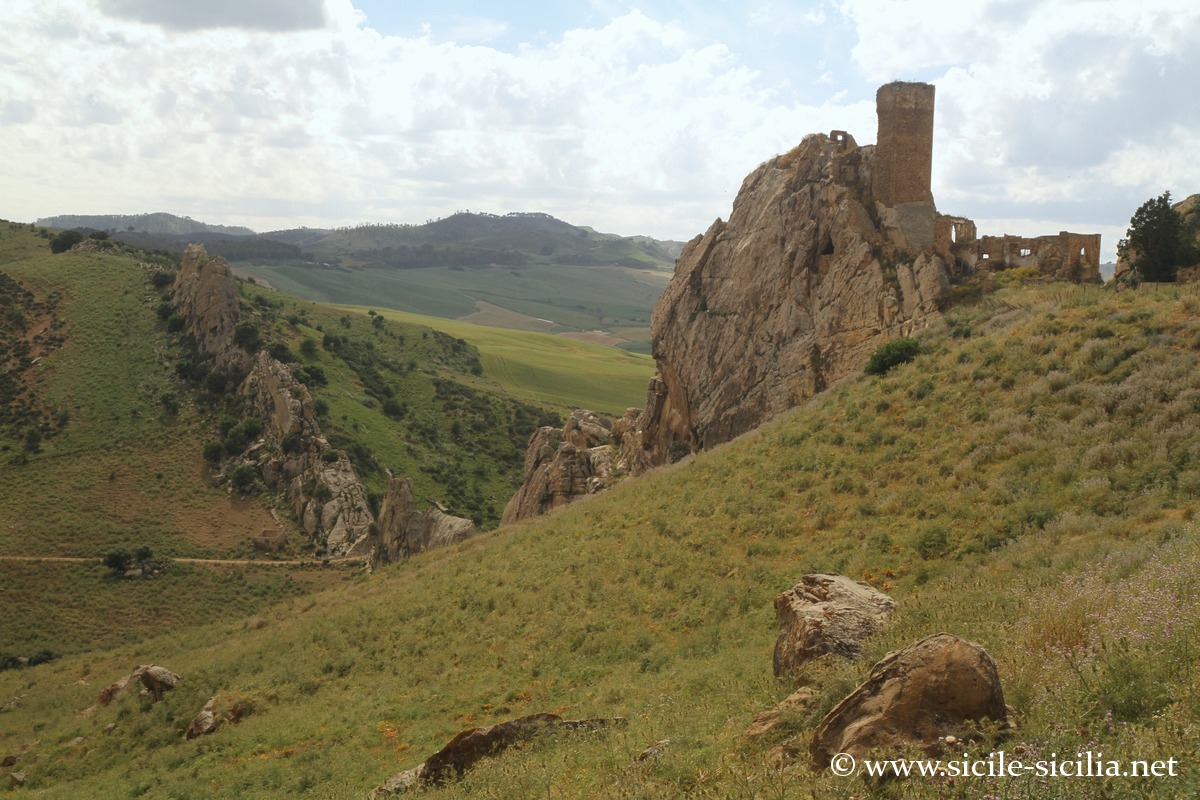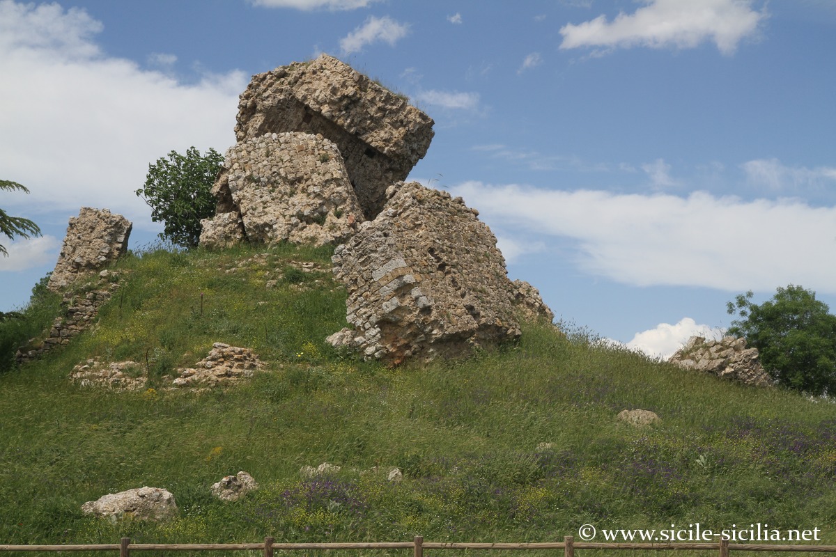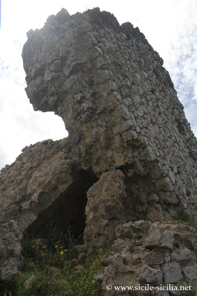 Il en reste peu de chose, avec d’épais pans de murs enchevêtrés et qui semblent en équilibre précaire, mais son imposante emprise reste visible, trônant sur un escarpement en surplomb de la vallée du Gornalunga.
