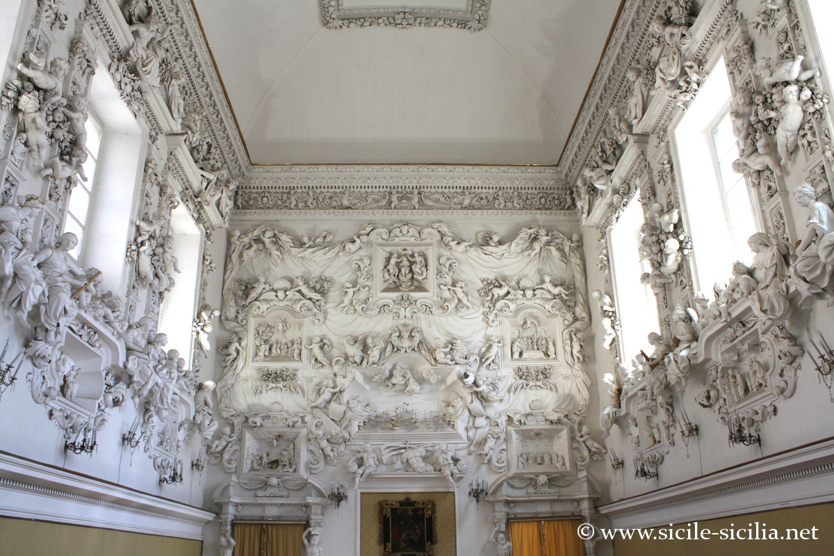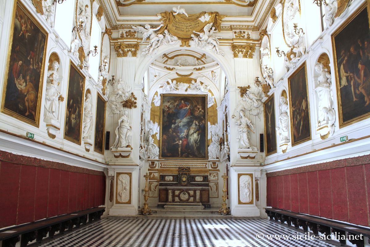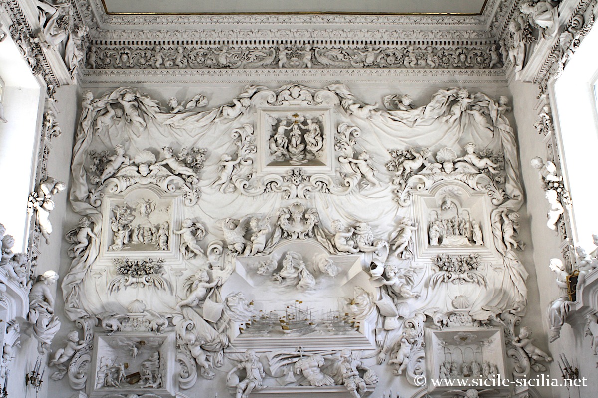 L’ornementation baroque y est foisonnante et raffinée avec les plafonds ornés de fresques, les parois couvertes de marbres, ou les stucs de Paolo Corso et Serpotta.