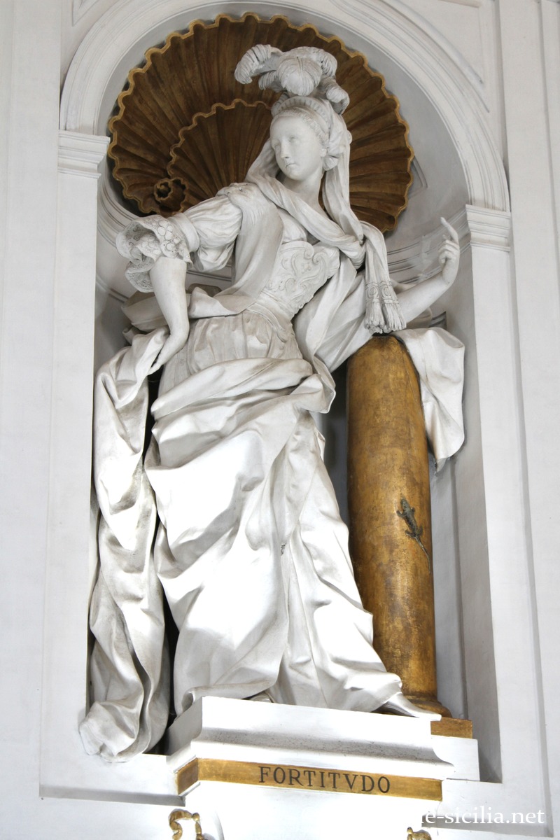 A la base des piliers soutenant le tambour de la coupole se trouvent les statues des quatre vertus théologales (Foi, Justice, Espérance et Charité) de Sperpotta et Sanseverino.