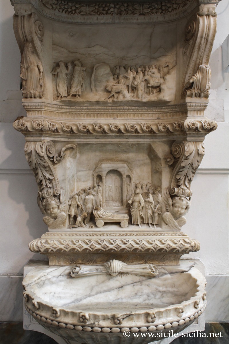 On trouve aussi un bénitier sculpté par Domenico Gagini contre un pilastre de la nef et divers restes sculptés du retable gaginien répartis dans la cathédrale après la restructuration du XVIIIe siècle.