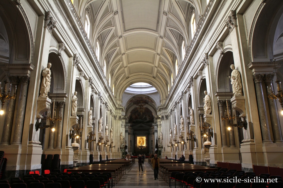 L’intérieur en forme de croix latine, est formé d’une nef principale et deux latérales. La nef centrale, d’une hauteur imposante, est caractérisée par des voûtes à caissons et des pilastres ornés de stucs qui créent un ensemble néoclassique harmonieux, résultat de la restructuration du XVIIIe siècle.