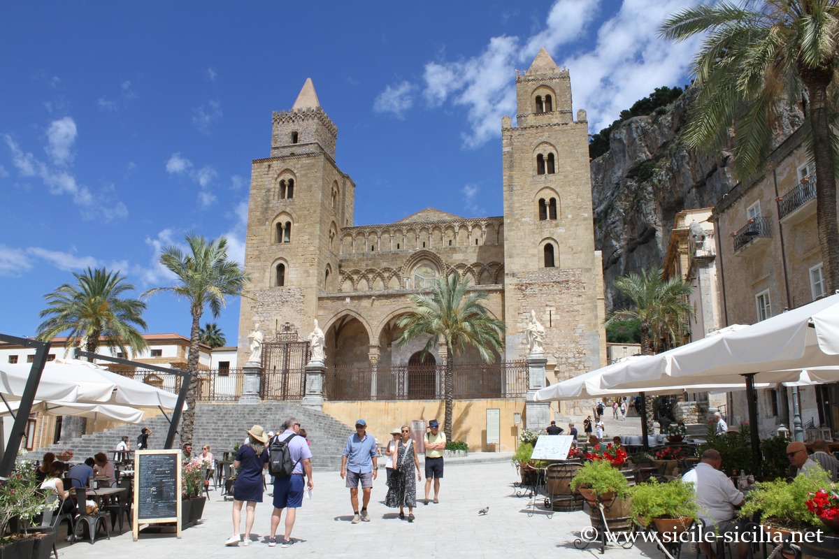 La cathédrale de Cefalù est l’édifice emblématique de la ville, qui se dresse au pied de la Rocca, le promontoire rocheux qui s’élève à 270 mètres au-dessus de la ville avec les vestiges du château et de Temple de Diane.