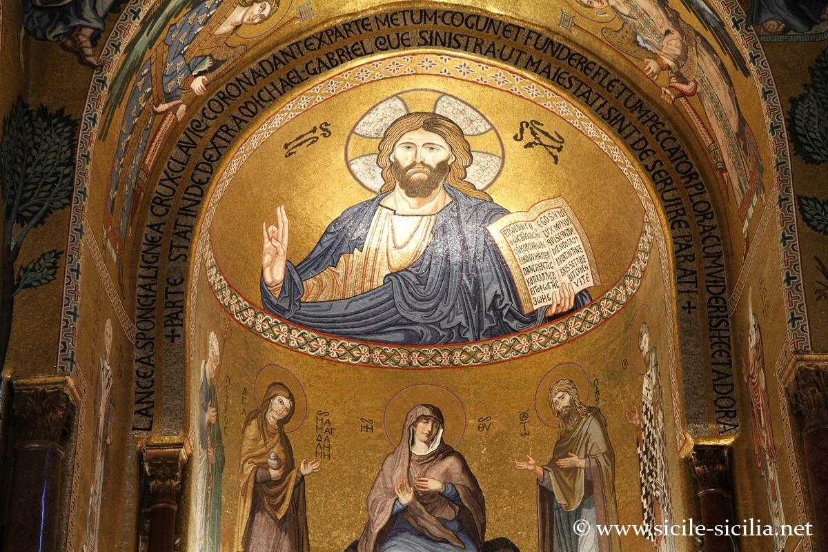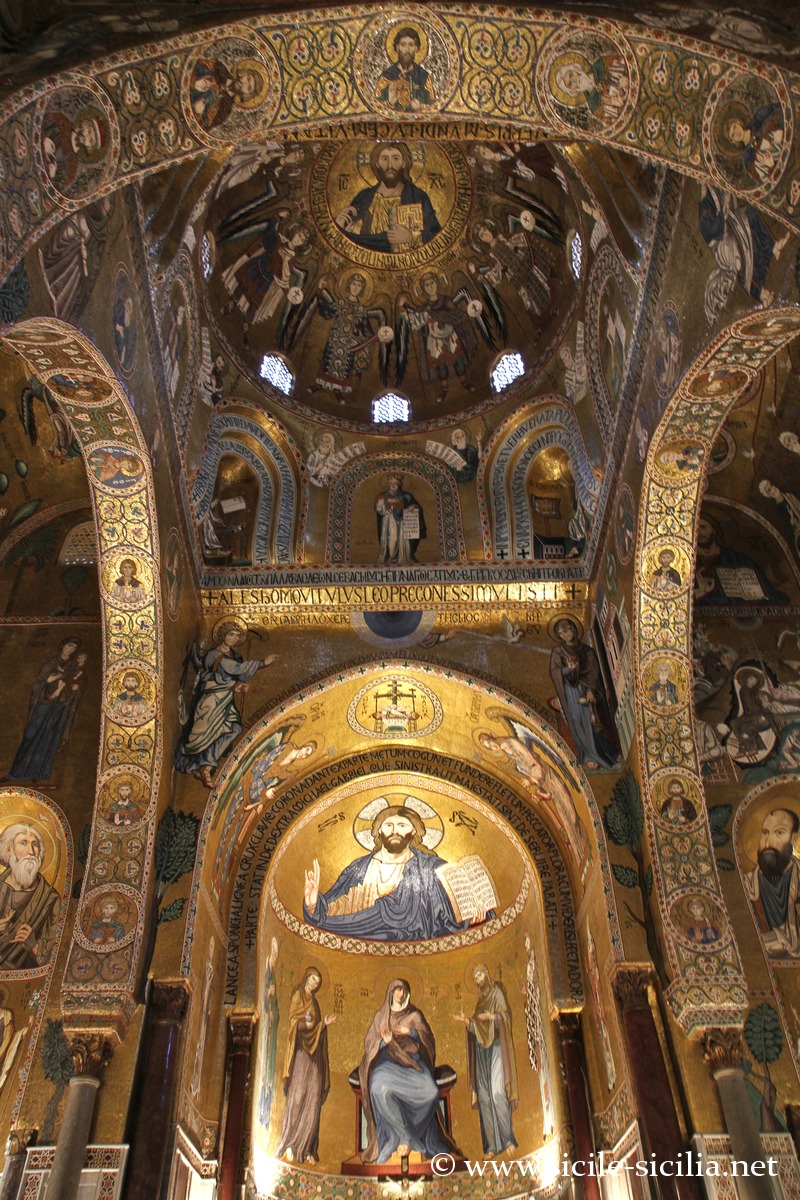 Le sanctuaire est entièrement recouvert de splendides mosaïques dorées créées par des artisans byzantins. Elles représentent des thèmes religieux avec un majestueux Christ Pantocrator dans la coupole, entouré d’Anges et d’Archanges, les évangiles et plusieurs scènes bibliques. Les plus anciennes d’entre elles sont celles de la coupole, remontant à la construction originale de 1143.