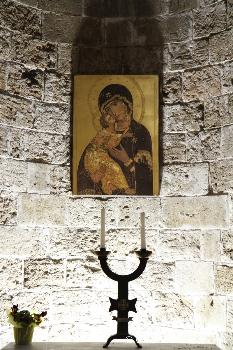 Le bel intérieur, sobre avec ses murs nus, est divisé en trois nefs séparées par des colonnes et arcades de style byzantin et conservant un très bel autel. Les ouvertures sont étroites et en forme de meurtrière, laissant lumière diffuser modérément, participant à l’atmosphère intime.