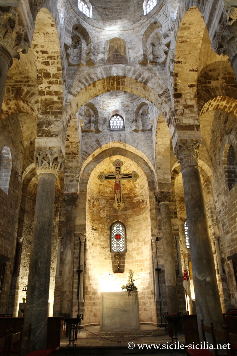 L’église est notable pour son aspect extérieur minimaliste et son intérieur sobre, contrastant avec la richesse ornementale d’autres églises contemporaines, comme la cathédrale de Palerme ou l’église Martorana située en face.