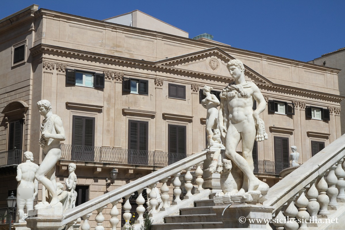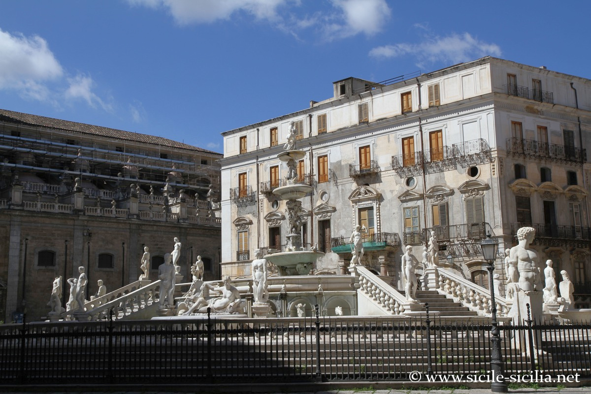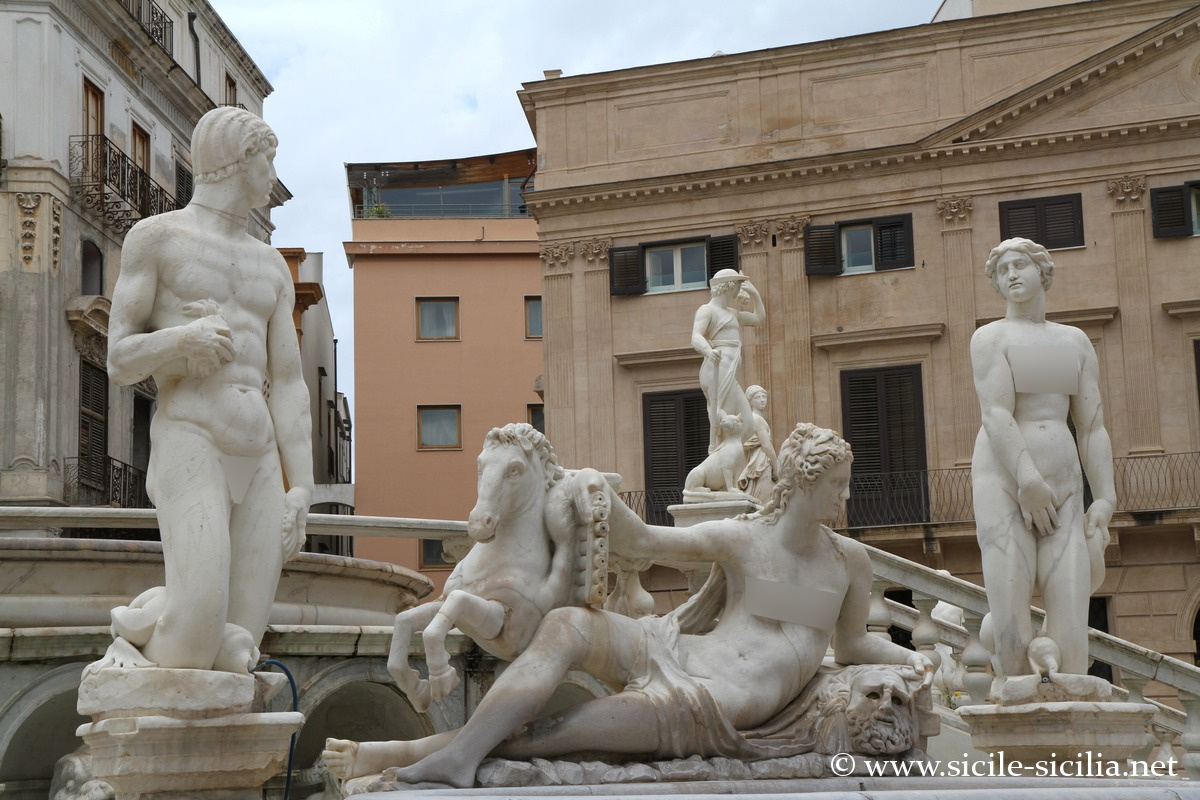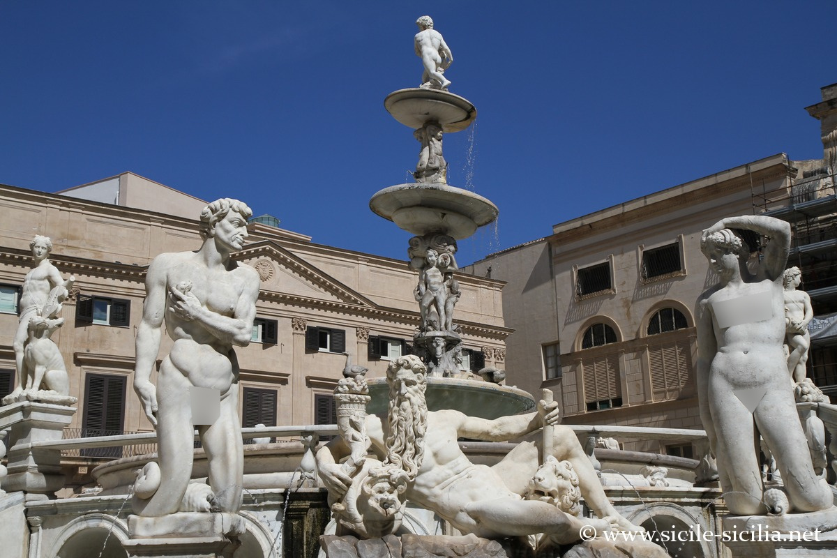 Aux XVIII et XIXe siècles, la place était appelée par les palermitains « Place de la Honte », en référence à l’administration corrompue de la ville, ainsi qu’à la nudité des statues de la fontaine.