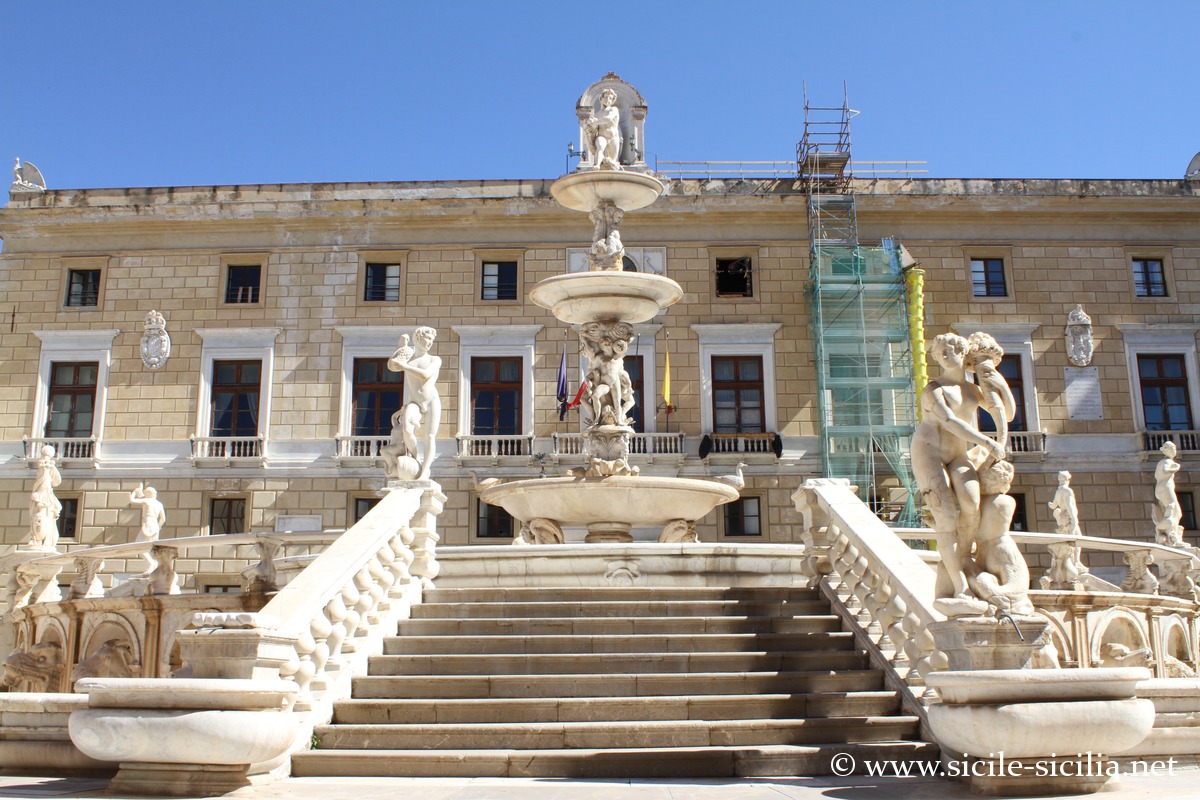 Une partie de l’ensemble arriva à Palerme en mai 1574 où elle fut installée et adaptée encore davantage à l’espace de la place avec plusieurs ajouts jusqu’en 1581 par Camillo Camilliani, fils du sculpteur Francesco, aidé de Michelangelo Naccherino.