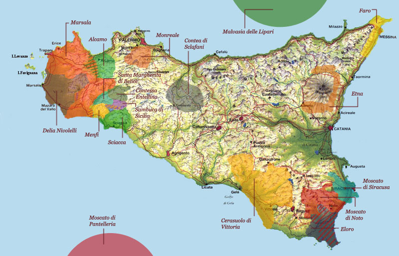 I luoghi principali dei vigneti della Sicilia, con le Isole Eolie e Pantelleria:
