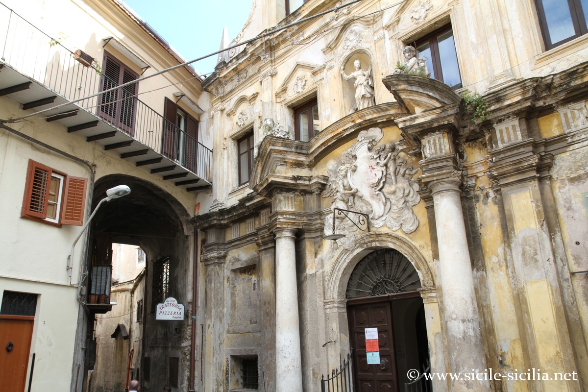 Le palais Cutò est un édifice aristocratique développé sur des structures antérieures, probablement liées au système défensif médiéval. Sa position élevée suggère une fonction à la fois résidentielle et de contrôle visuel du territoire, illustrant l’implantation des familles nobles dans l’orbite du pouvoir ecclésiastique de Monreale. Il conserve une cour intérieure et une terrasse panoramique offrant une vue directe sur la Conca d’Oro et Palerme. Une partie du bâtiment est aujourd’hui aménagée en structure d’hébergement de type chambre d’hôtes, intégrée à la résidence historique.