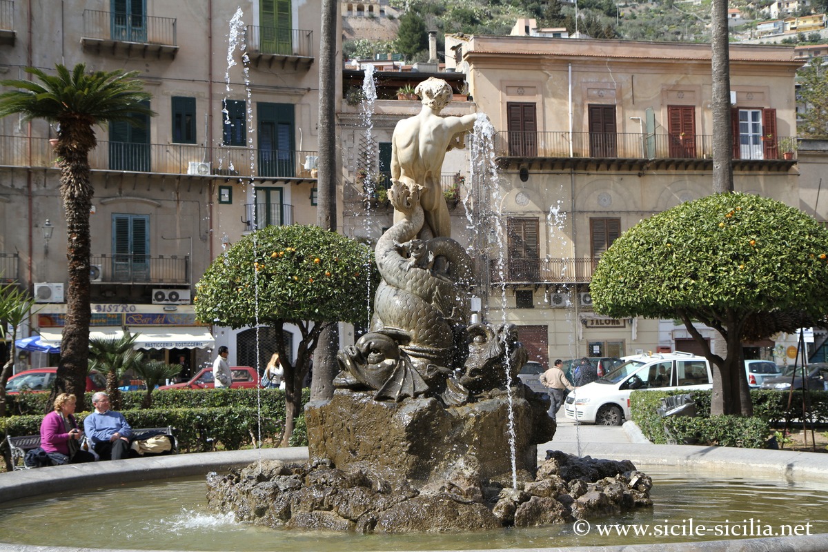 - Au centre de la Piazza Vittorio Emanuele se trouve la belle Fontaine du Triton (Fontana del Tritone) de 1881 avec son bassin en marbre de forme circulaire, et au centre l’homme triton sur des rochers, vainquant les dragons qui émergent des eaux.