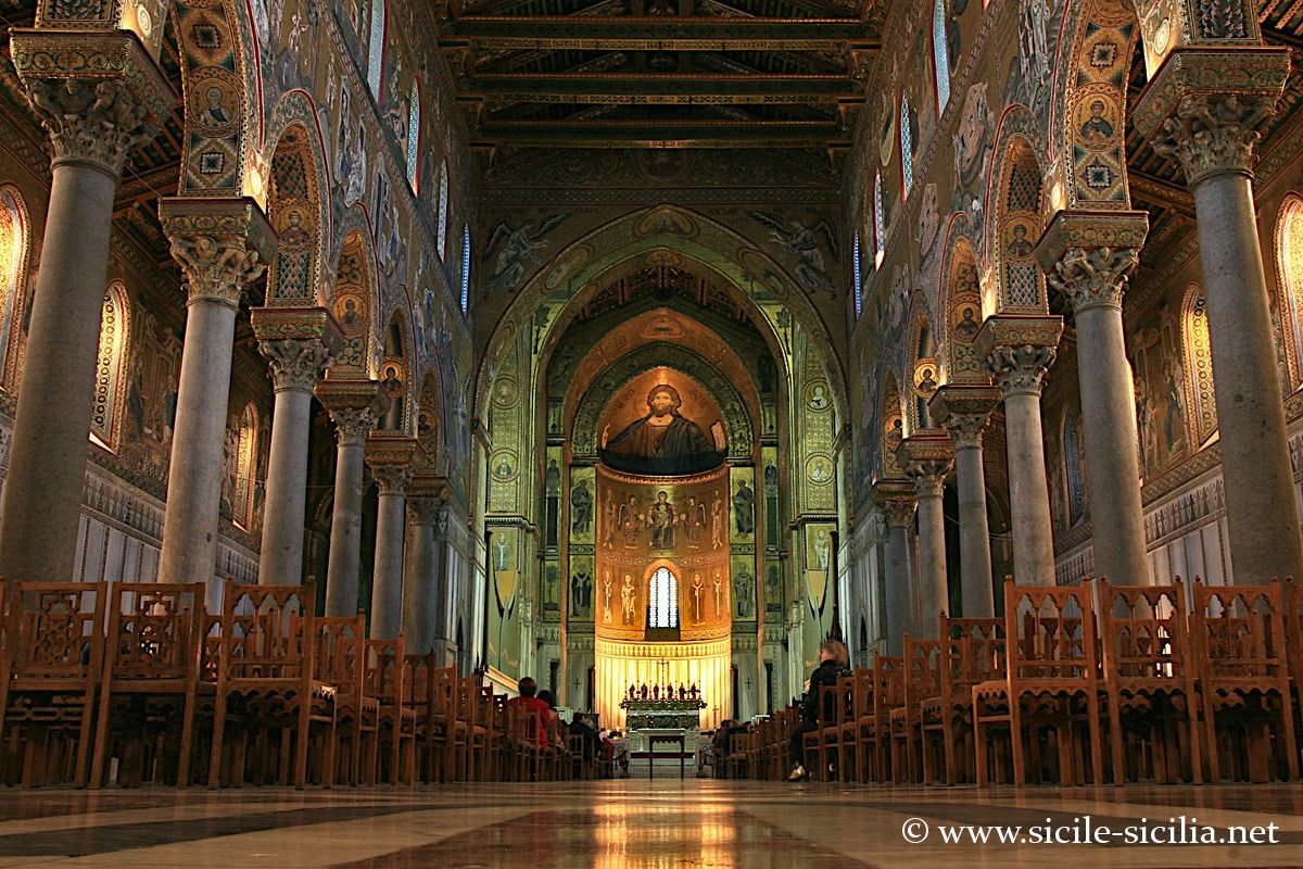 C’est l’un des plus bel exemples de cette architecture, mêlant les influences normandes, arabes et byzantines. Son intérieur détonne avec le 42 grandes mosaïques qui couvrent près de 6 400 m².