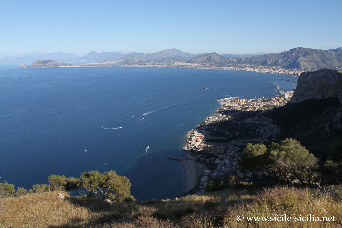 La route asphaltée aboutit au belvédère avec son panorama sur la côte, la baie de Mondello, et les monts des environs.