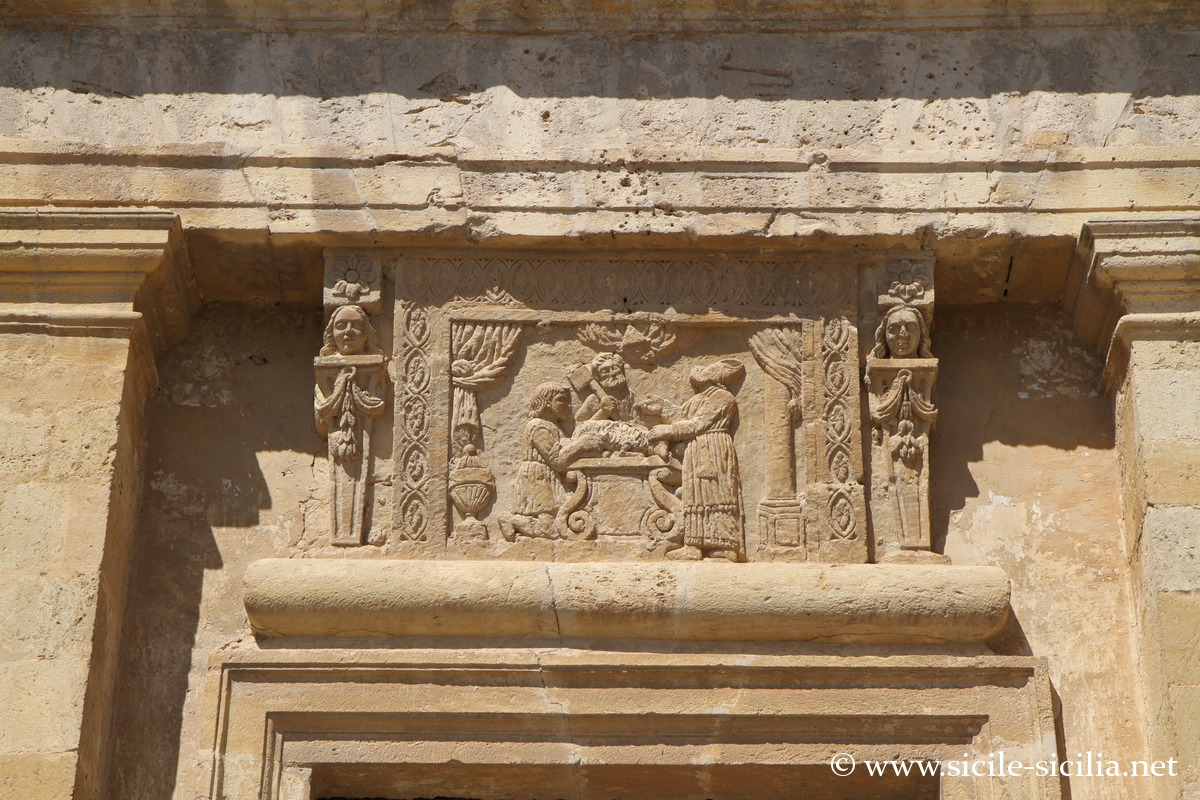 Le portail d’entrée, dans le style Chiaramonte, est orné d’un arc en ogive soutenu par quatorze colonnettes finement décorées.