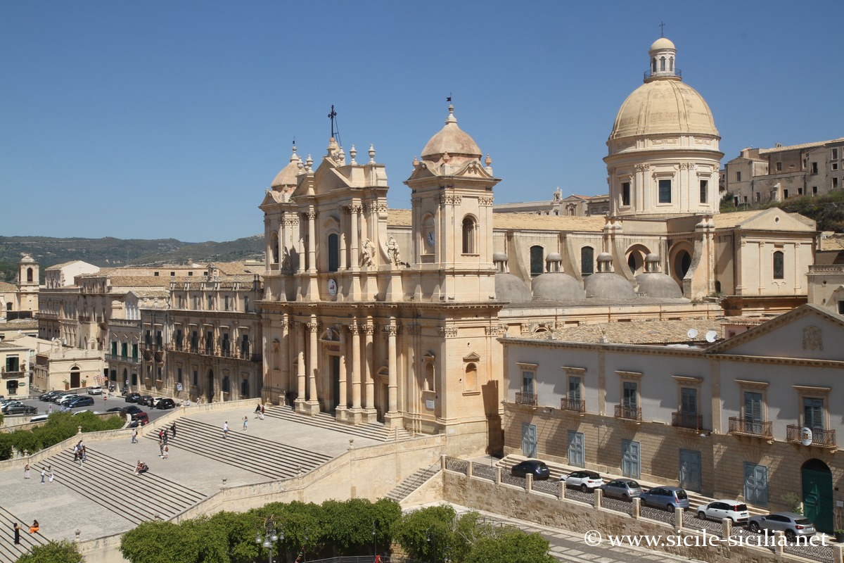- Le Duomo di Noto (Cathédrale San Nicolò) : situé au sommet d’un large escalier, il constitue le point d’ancrage visuel de l’axe nord-sud principal et symbolise la reconstruction baroque de la ville.