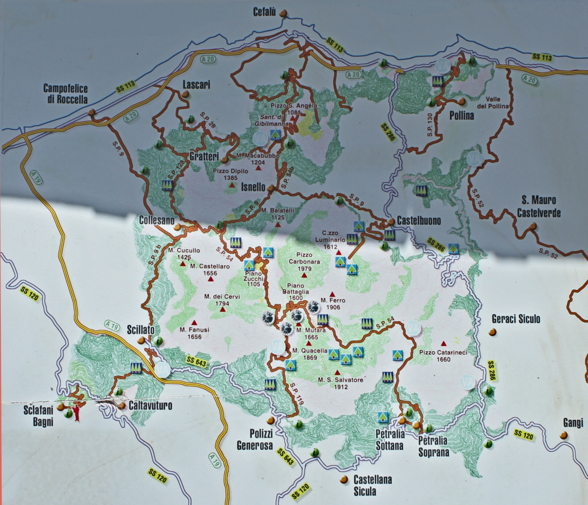 - A proximité, à l’est du massif, mentionnons aussi Pollina et San Mauro Castelverde, entre lesquelles se trouvent les gorges de Tibère (Gole di Tiberio)