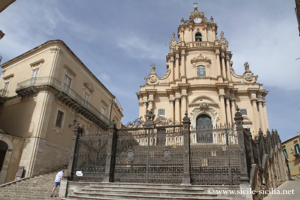 Le Duomo di San Giorgio (cathédrale Saint-Georges) est l’emblème de Ragusa Ibla. Dessiné par Rosario Gagliardi à partir de 1738 pour remplacer l’église antérieure détruite en 1693, sa façade d’un baroque dynamique et théâtral est composée de colonnes monumentales et de statues de saints disposées en arc de cercle, renforçant l’effet de mouvement. L’intérieur, à trois nefs séparées par de massifs piliers, conserve un décor raffiné et des autels en marbre polychrome. Le dôme, ajouté en 1820 dans un style néoclassique inspiré du Panthéon de Paris, domine l’ensemble urbain. L’église abrite d’importantes œuvres d’art, dont un retable de Vito D’Anna et plusieurs reliquaires en argent du XVIIIᵉ siècle.