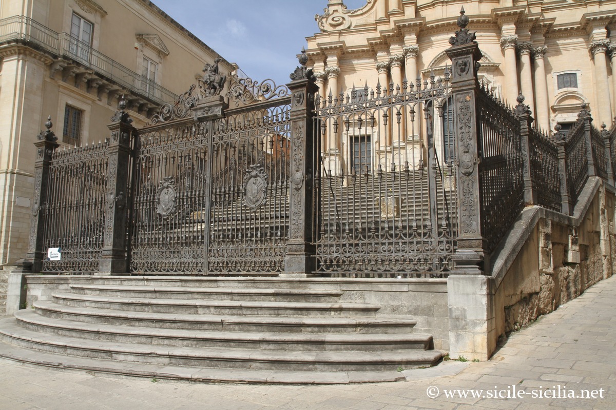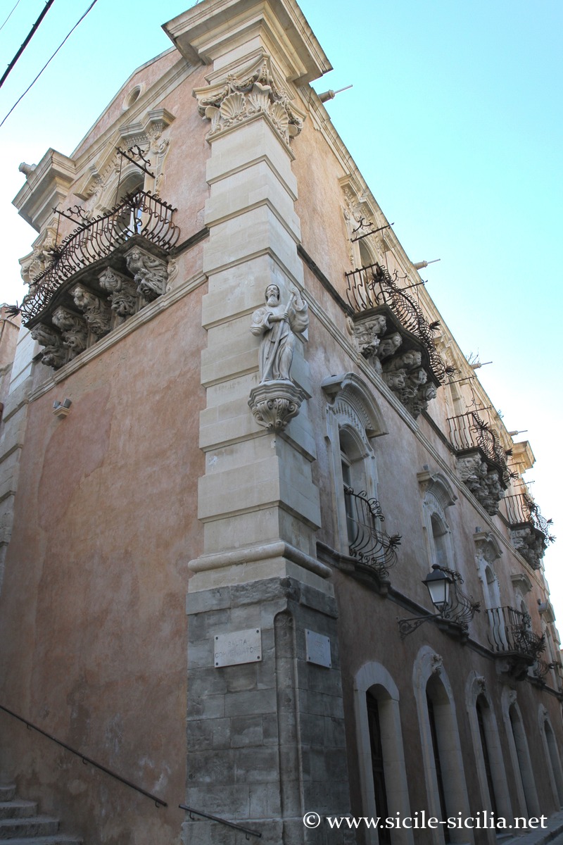 À proximité immédiate, en montant vers Ibla, se trouve le palais Palais Sortino‑Trono, construit en 1778 sur les ruines du château médiéval, il se distingue par sa façade monumentale et ses balcons soutenus par des mascarons baroques. L’intérieur abrite encore des plafonds peints et un escalier monumental.