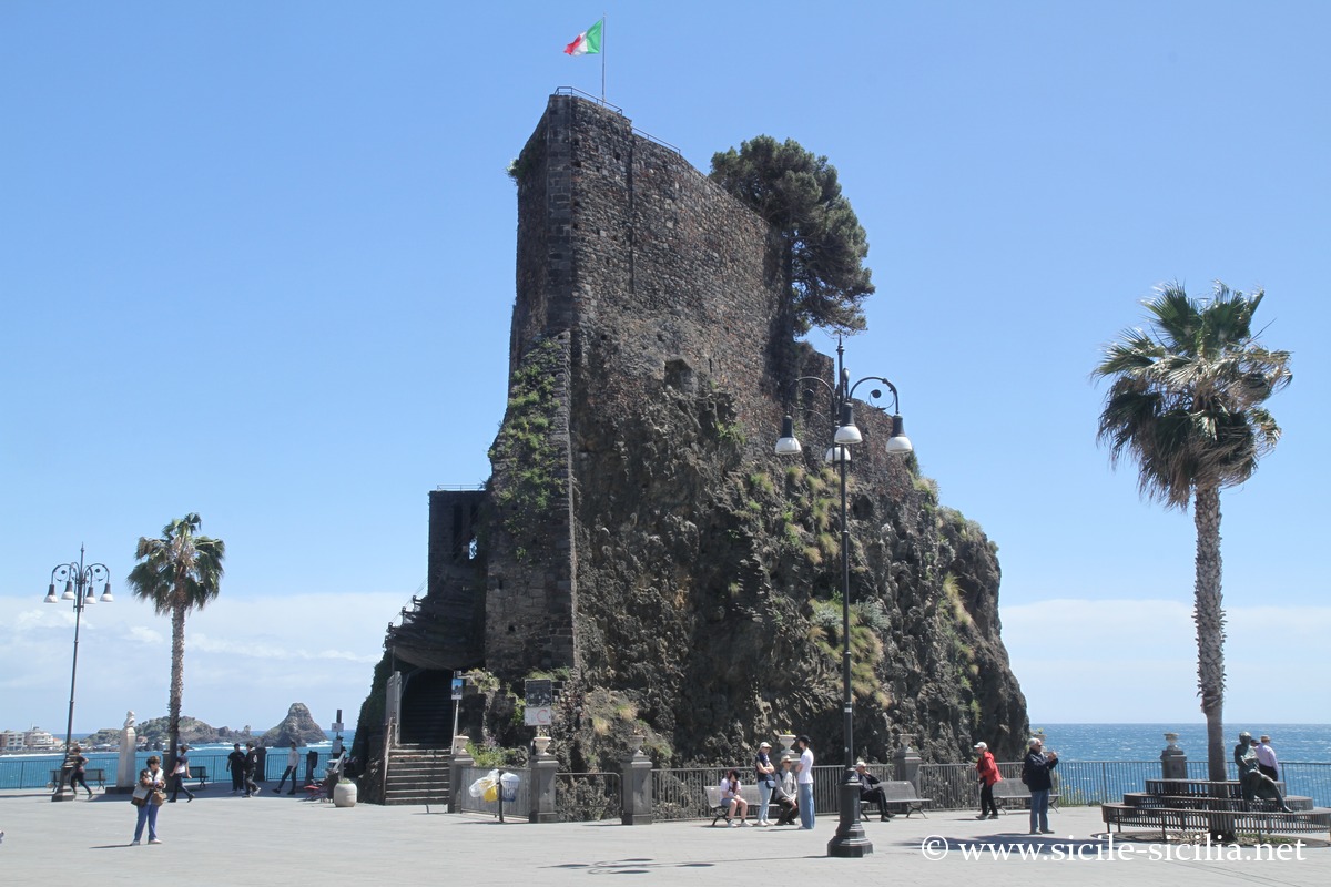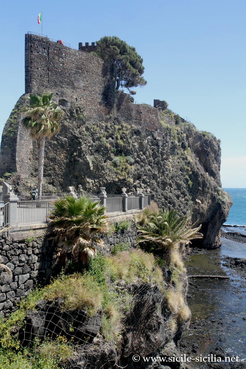 Depuis Catane, on atteint d’abord Aci Castello (à environ 10-15 km), dominée par un château normand construit sur un promontoire de roche volcanique issu d’anciennes coulées de lave de l’Etna.
