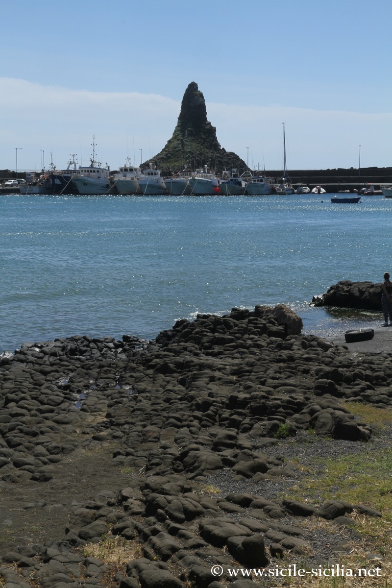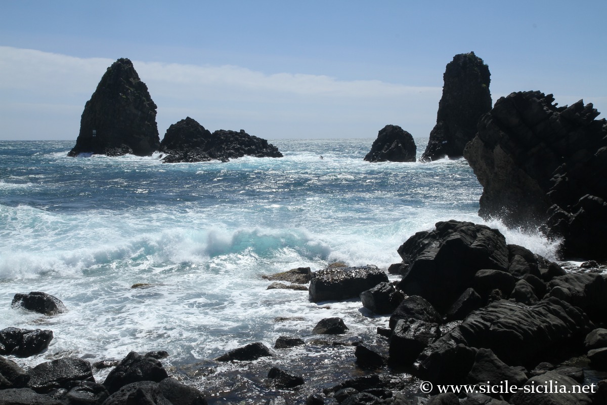 Aci Trezza a la côte la plus saisissante. Le panorama maritime est dominé par les faraglioni (aussi appelés parfois Îles des Cyclopes), grands rochers basaltiques surgissant de l’eau comme des châteaux de pierre. L’île de Lachea est la principale du petit archipel, elles font partie de la réserve naturelle marine des îles des Cyclopes, gérée par l’Université de Catane. Ces rochers sont des vestiges de formations sous-marines solidifiées ou des restes de coulées de lave. Selon la mythologie, ce sont des pierres lancées par le cyclope Polyphème contre Ulysse, furieux d’être aveuglé par ce dernier.