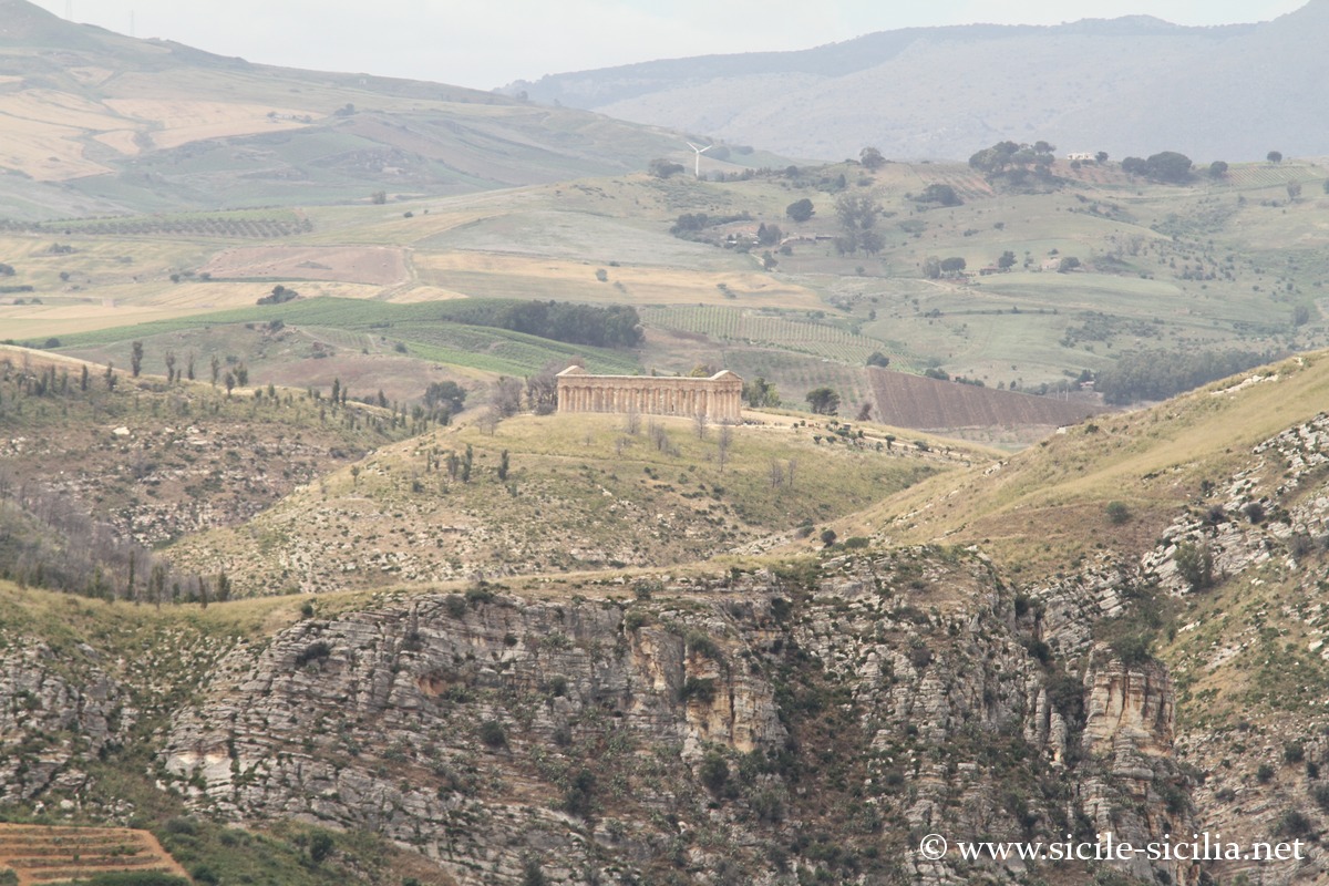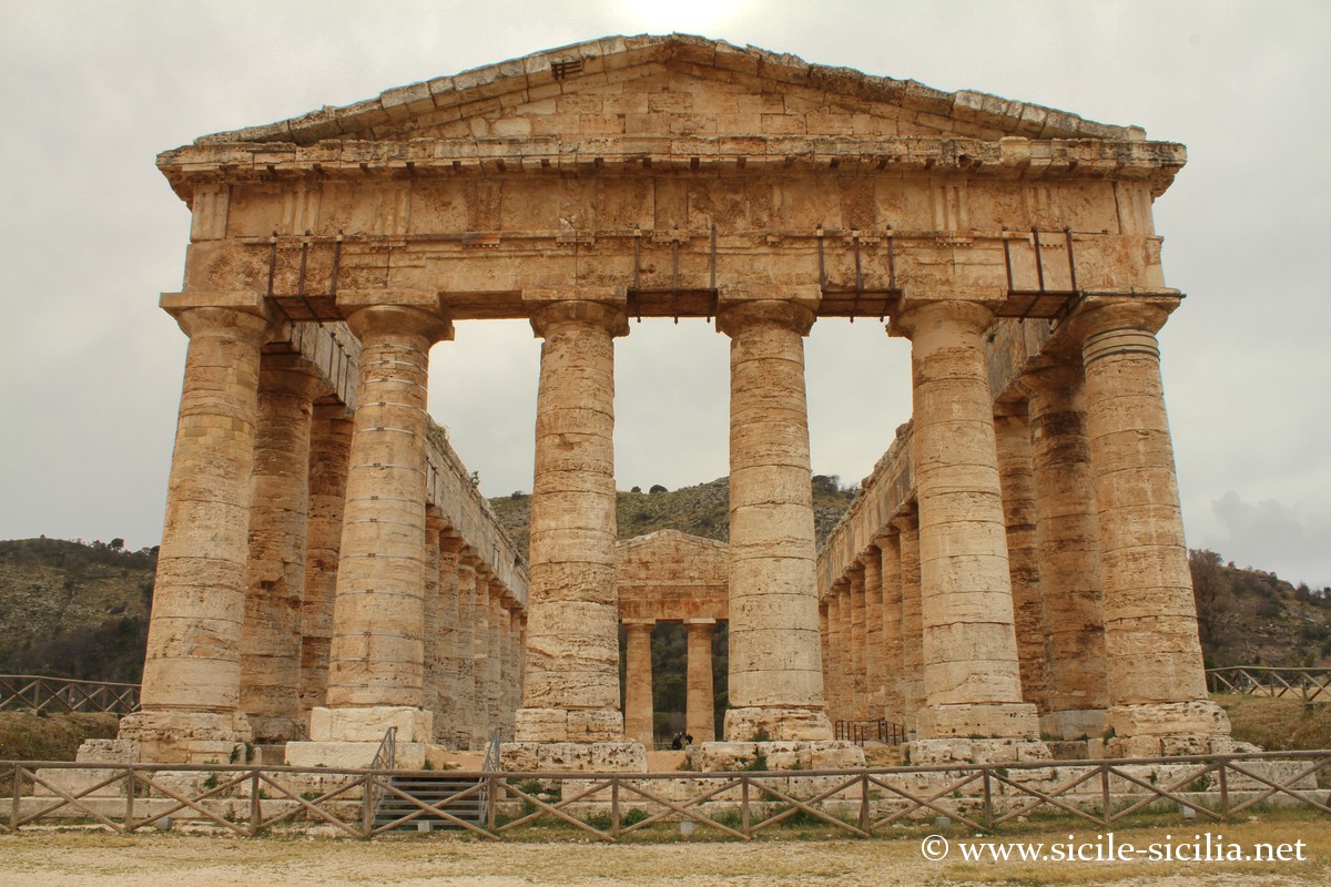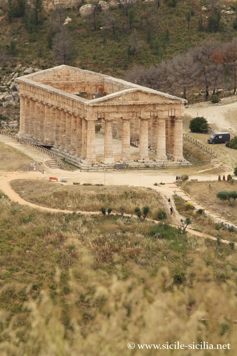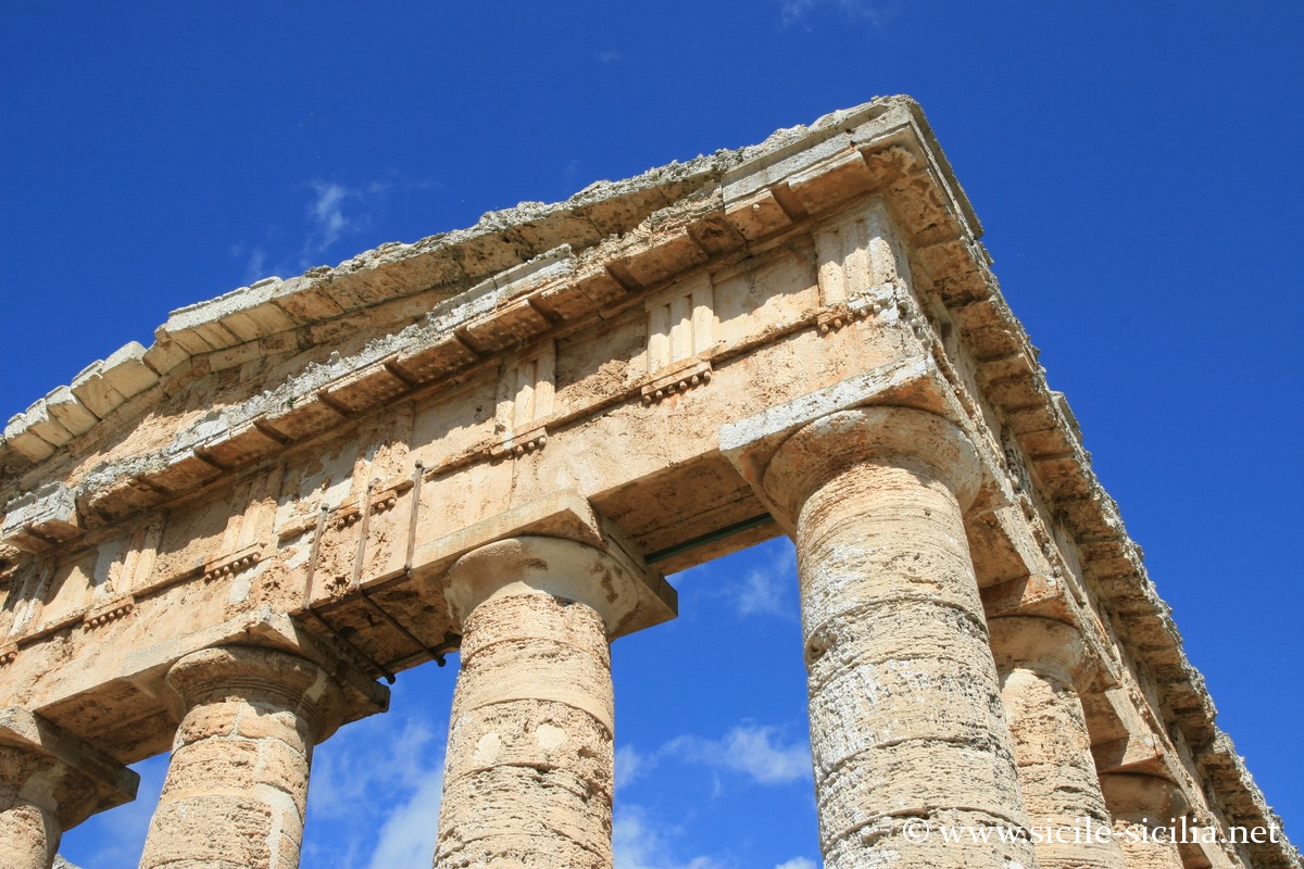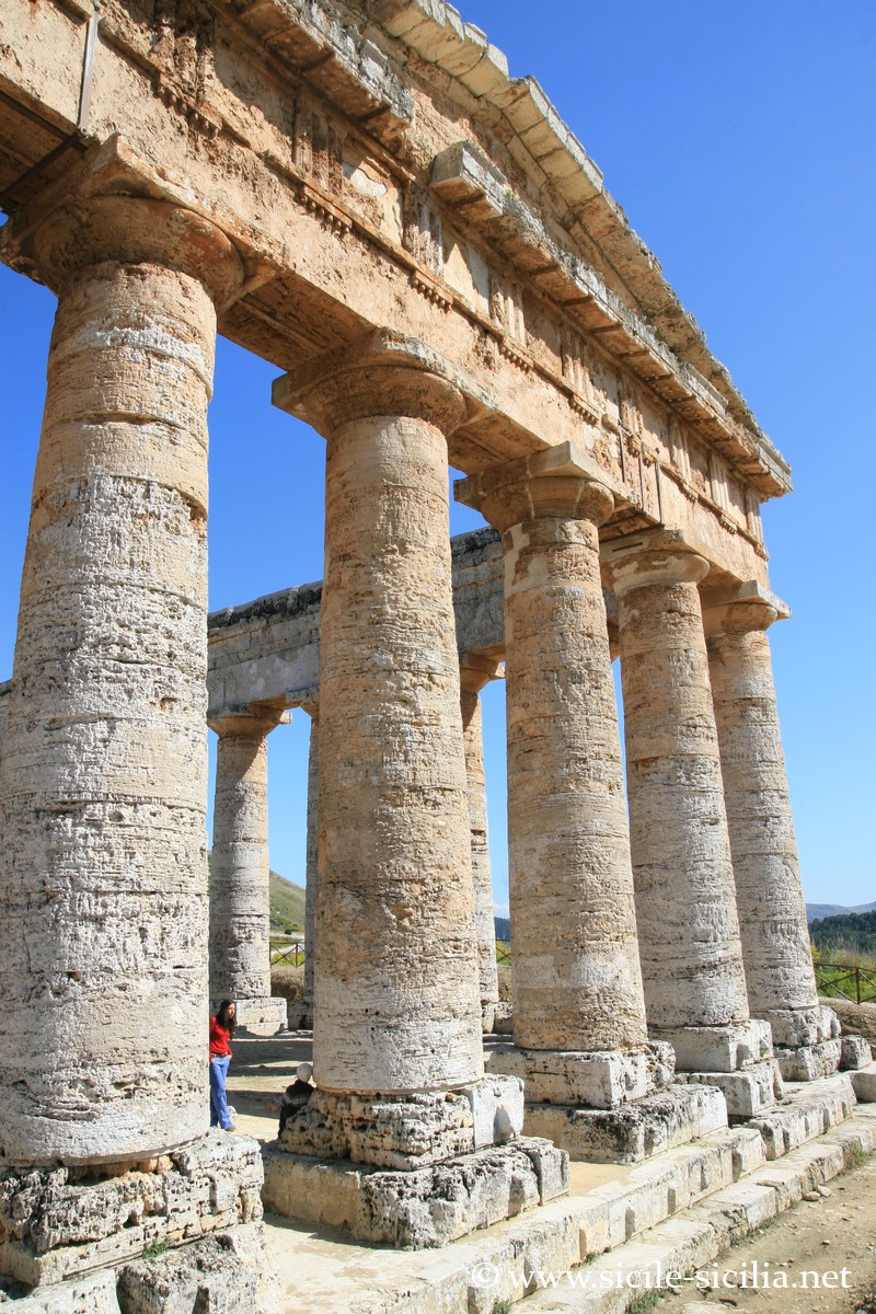 Le Temple grec de Ségeste est un périptère de style dorique avec 6 par 14 colonnes, qui est resté inachevé. L’absence de cannelures sur les colonnes et le non-achèvement du stylobate confirment l’interruption brutale du chantier.