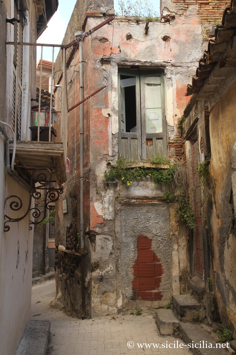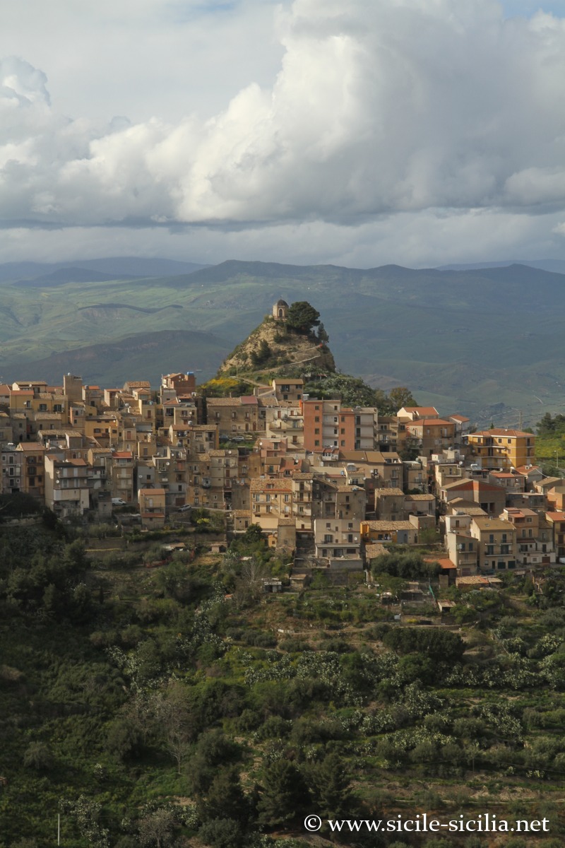 La ville, comptant près de 12 000 habitants, conserve également des ruelles médiévales et des vestiges d’habitations troglodytiques taillées dans la roche volcanique. Elle est bâtie sur un neck volcanique de basalte formé il y a environ 550 000 ans, avec un beau point de vue panoramique sur la plaine de Catane et l’Etna.