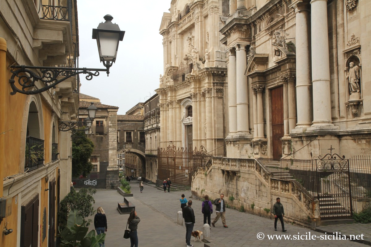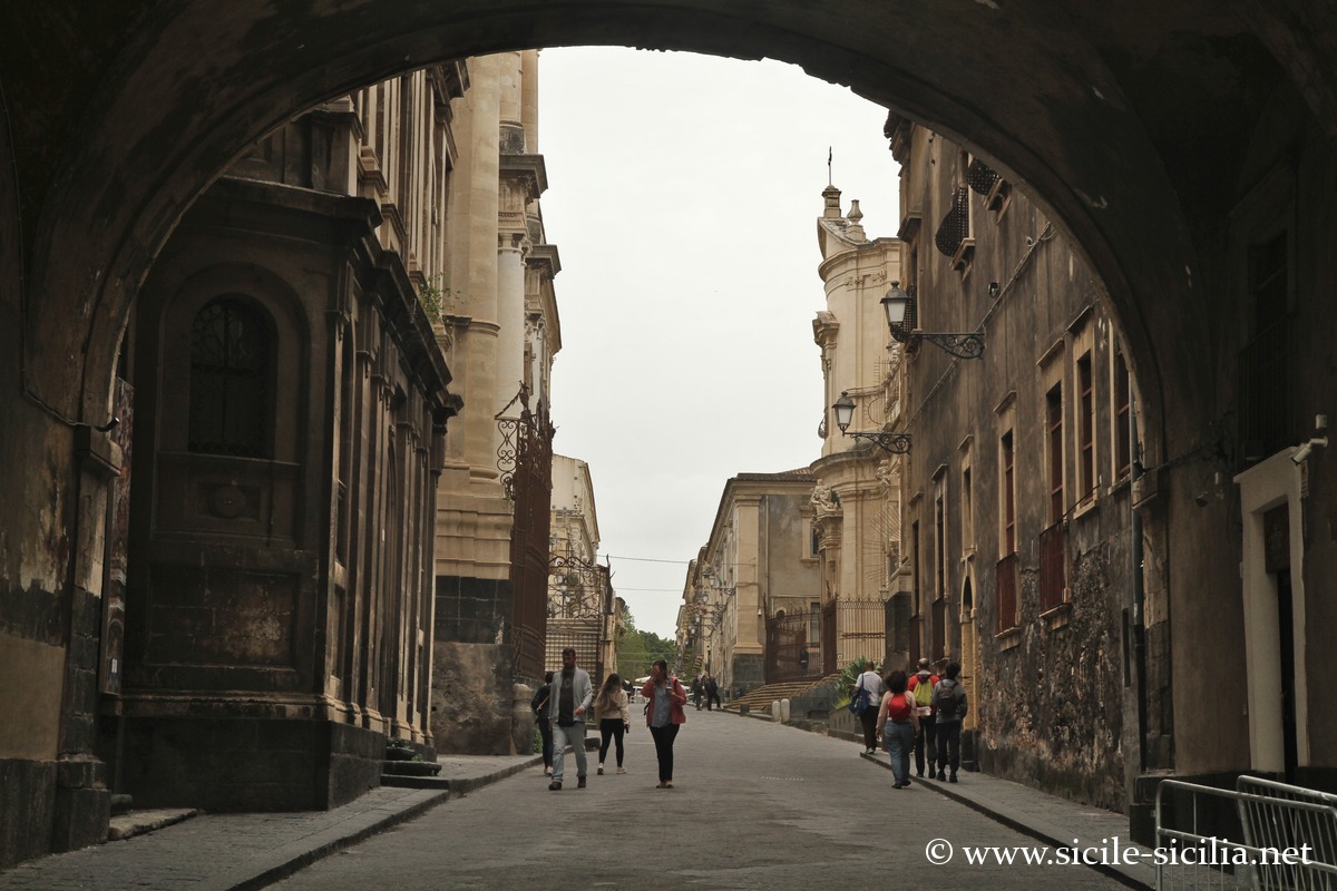 L’arche suspendue qui traverse la Via Crociferi relie la grande abbaye, avec son église Saint-Benoit (San Benedetto), à la petite abbaye. Appelée aussi « Arco delle Monache » (Arche des Nonnes), elle fut construite pour permettre aux religieuses cloîtrées de circuler entre les deux bâtiments sans sortir du monastère.