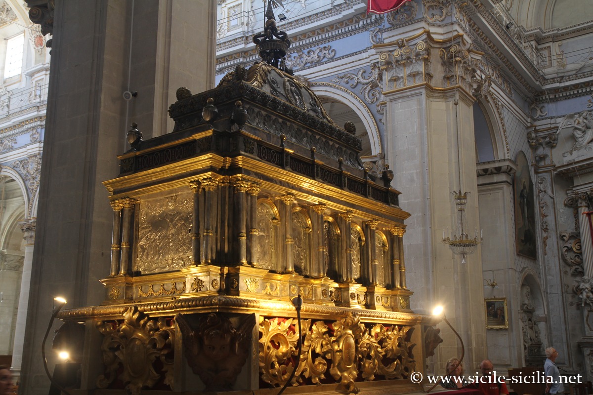 En façade se trouvent quatre statues représentant San Cataldo, Santa Rosalia, San Pietro et la Madone, et plus haut Jésus-Christ en triomphe.