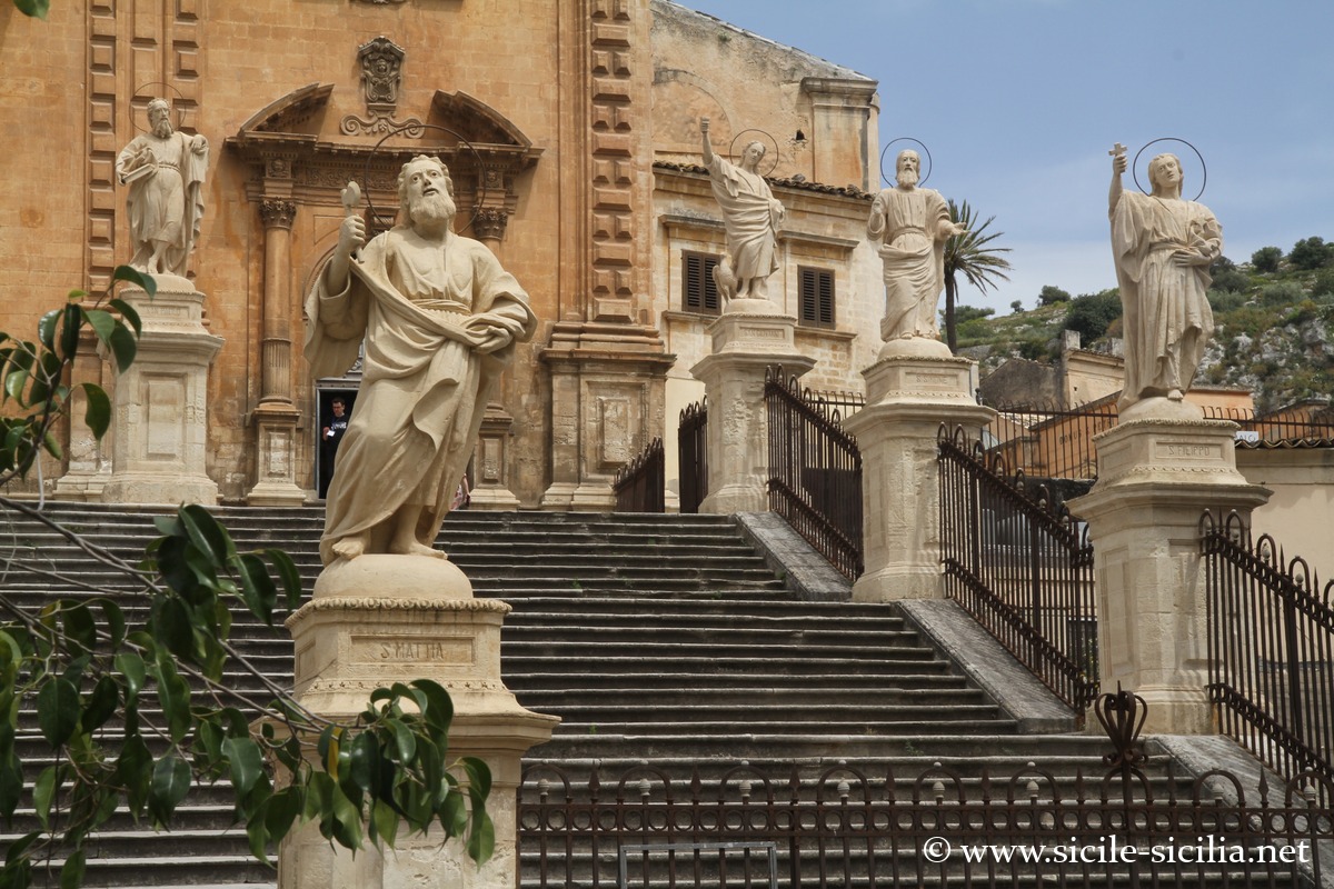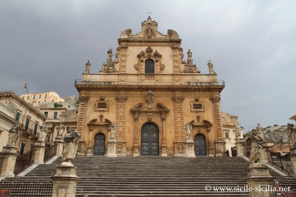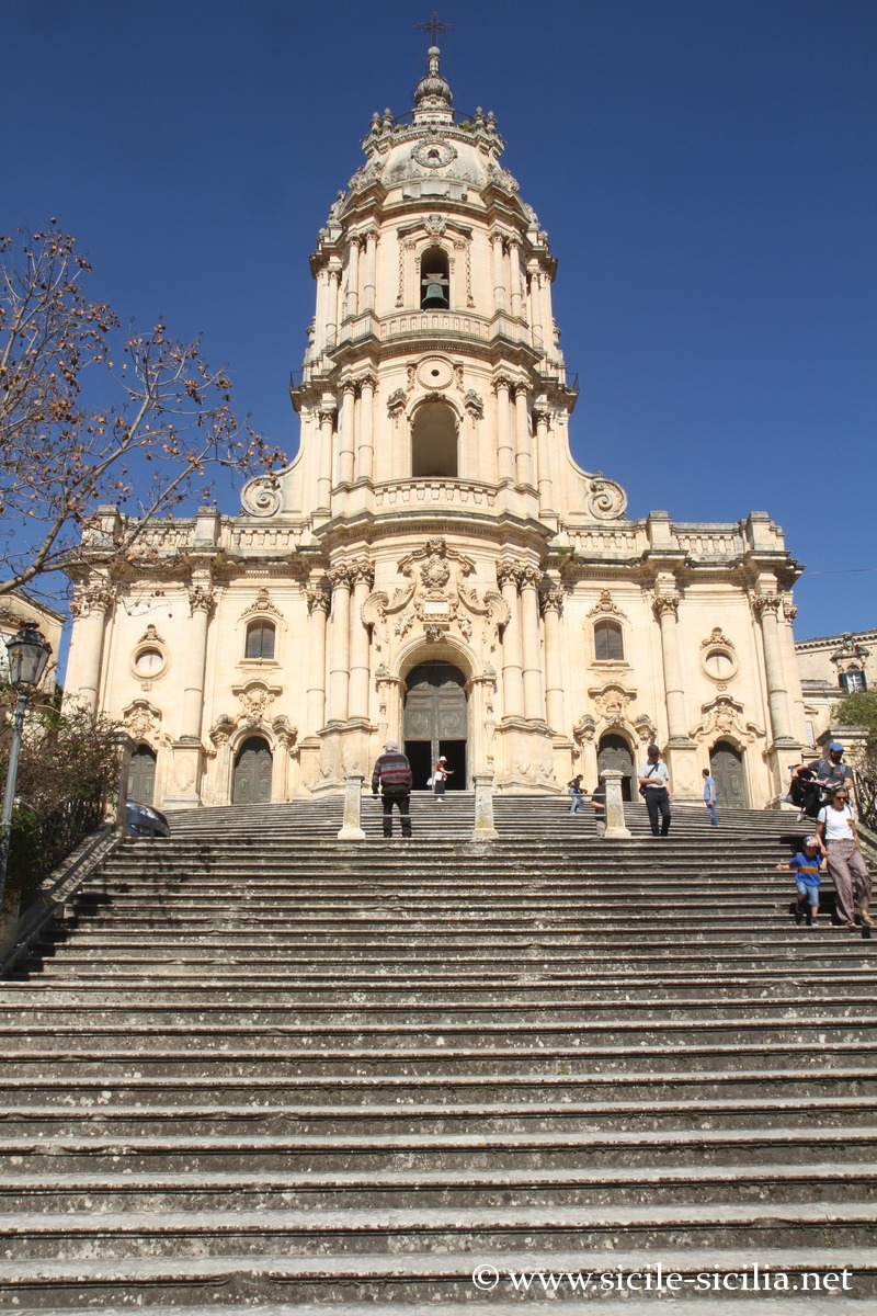 Dominant Modica Bassa de ses 62 mètres de hauteur, sa façade élancée est précédée par un majestueux escalier de 250 marches construit en 1818, flanqué de palmiers et la reliant à la ville basse.