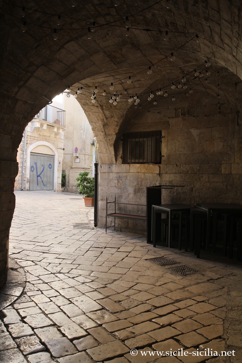 Sur les hauteurs de Modica Bassa, montant vers Modica Alta, se dressent les vestiges de l’ancien château, et autour le quartier le plus ancien de la ville, où s’enchevêtrent des ruelles de charme, des escaliers, passages voûtés entre les maisons parfois adossées, voir littéralement taillées dans la roche calcaire, intégrant des grottes qui servaient d’habitations ou de réserves.