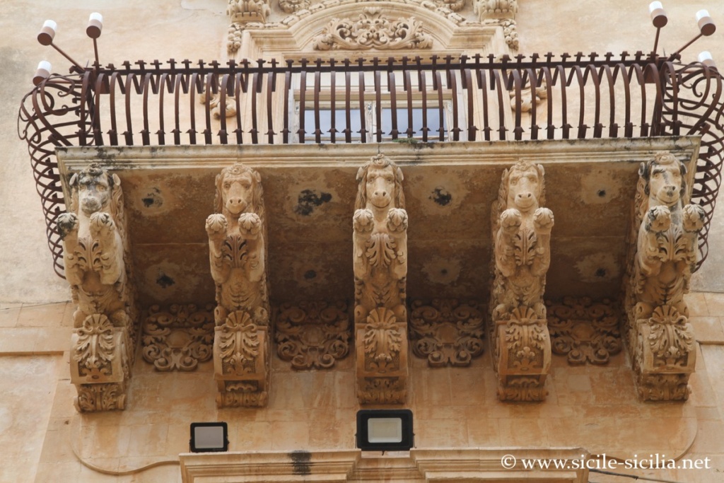 Palais purement baroque (construction de 1720 à 1765) attribué à l’architecte Rosario Gagliardi dont la façade est célèbre pour ses balcons richement décorés, soutenus par des consoles sculptées représentant sirènes, sphinx, lions, chevaux ailés, avec leurs grilles courbes.