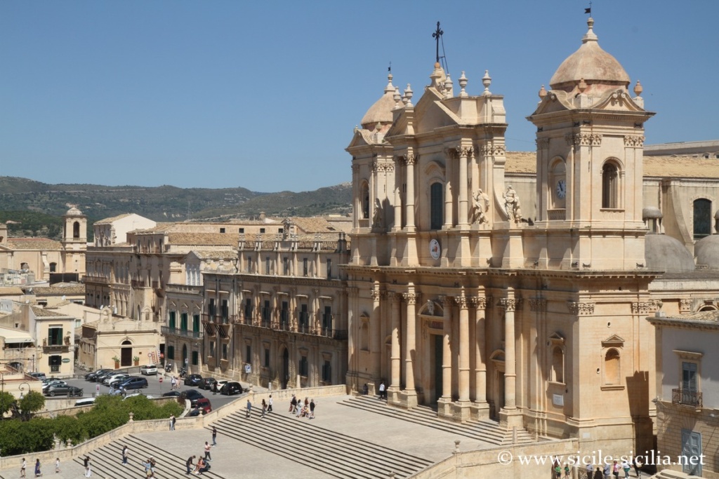 Elle est dédiée à Saint Nicolas de Myre. Sa façade en calcaire doré est d’une grande ampleur, précédée d’un escalier monumental scénographique, face au Palais Ducezio, avec ses deux clochers et mêlant baroque et néoclassqiue. L’intérieur, d’une blancheur remarquable, conserve des œuvres baroques ainsi que des éléments provenant de l’ancienne Noto (notamment l’arche en argent de San Corrado d’Assergi).